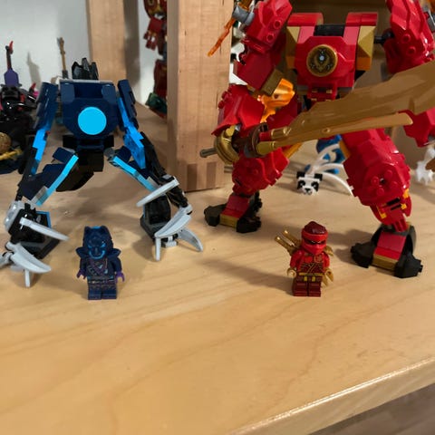 Lego Ninjago byggset med två mecharobotar. Setet innehåller delar för att bygga två olika figurer i Ninjago-tema samt instruktionshäfte. Rekommenderad ålder från 6 år och uppåt. Passar för barn som gillar att bygga och leka med Ninjago-inspirerade robotfigurer.