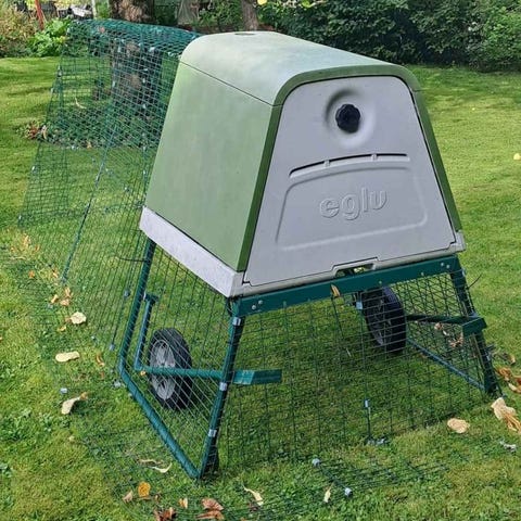 Omlet hönshus med utegård i plast i rosa och grå färg. Hönshuset står på marknivå och är anslutet till en nätinhägnad utegård. En ramp leder från hönshuset ner till marken. I utegården finns mat- och vattenbehållare anpassade för höns. Passar för hållning av ett mindre antal höns i trädgård eller på mindre gård. Inköpt i höstas för ca 16.000kr