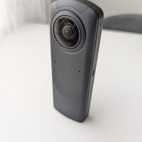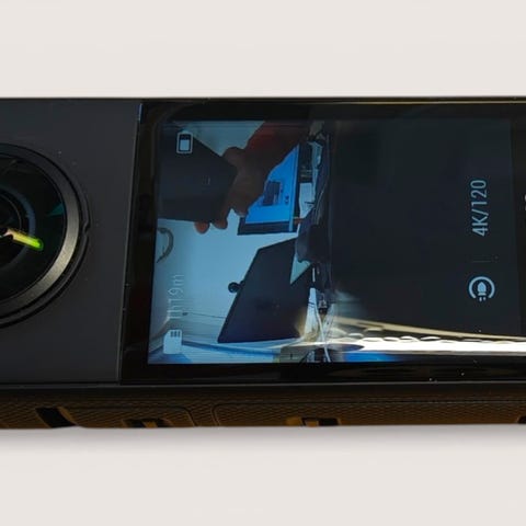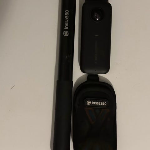 Insta360 One X 360-kamera i svart utförande. Kameran har dubbla linser för inspelning av 360-video och stillbilder. På bilderna syns bland annat stativ/selfiestick, skyddshöljen för linserna, monteringsram/fäste samt batteri i separat batteribox. Passar för inspelning av 360-material vid exempelvis resor, aktiviteter och dokumentation i både inomhus- och utomhusmiljöer. Kameran styrs via inbyggd skärm och knappar samt kan anslutas till mobil via Insta360s app för överföring och redigering av material.
