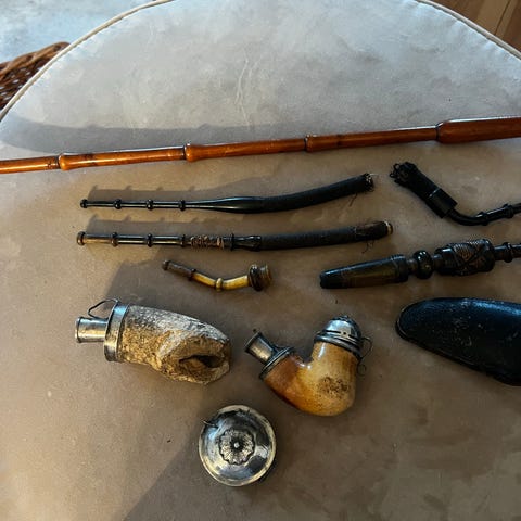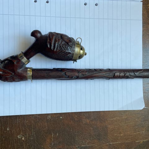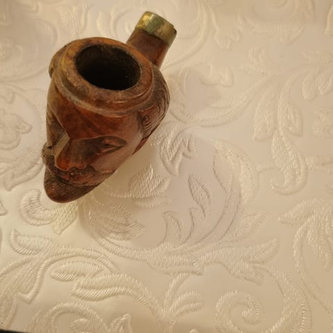 Träpip med långt skaft och utskuret dekorativt motiv. Piphuvudet har metallock med gångjärn och kedja/fästsnöre. Delar av pipan är avtagbara, vilket syns på bilderna. Passar som samlarföremål eller prydnadsobjekt för den som är intresserad av äldre pipor och tobaksrelaterade föremål.