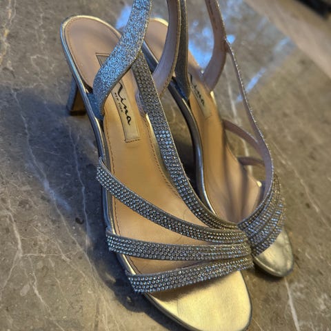 Steve Madden sandaler med hög smal klack i storlek 39. Modellen har smala remmar dekorerade med strass och en blank silverfärgad finish. Öppen tå och öppen häl med justerbar rem runt ankeln. Passar exempelvis till fest och andra mer uppklädda tillfällen. Nypris var 1700kr