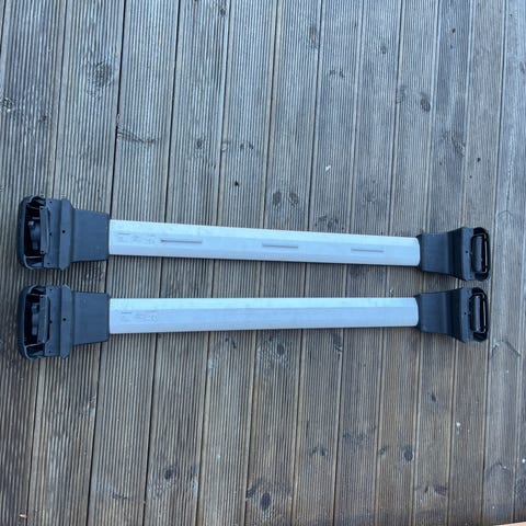 Lastbågar (inkl. nycklar )i aluminium med svarta och vita detaljer. Består av två längsgående räcken som monteras på bilens tak. Passar för montering av tillbehör som takbox, cykelhållare eller lastbågar, beroende på bilmodell och fästen. Utförande i metall med plastdetaljer vid infästningarna.
