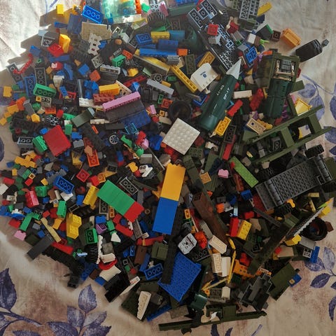 LEGO blandade klossar i olika färger och former. Innehåller lösa bitar från övriga LEGO-teman, sorterade i flera plastpåsar. Passar för fri bygglek, komplettering av befintliga LEGO-samlingar eller reservdelar till olika byggen. Exakt antal bitar och specifika set ingår ej specificerat. Allt lego är tvättat och paketerats i plastpåsar totalt ca 3-4kg