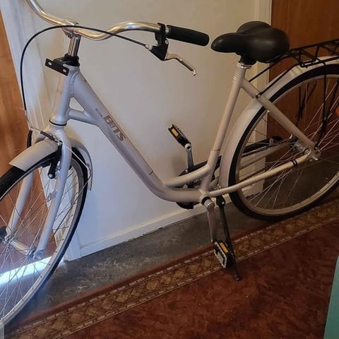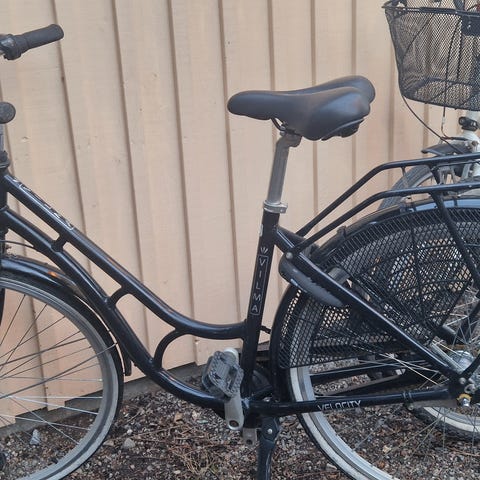 28” cykel. Framljuset tror jag inte fungerar. Medföljer avtagbar cykelkorg. Fungerar fint!