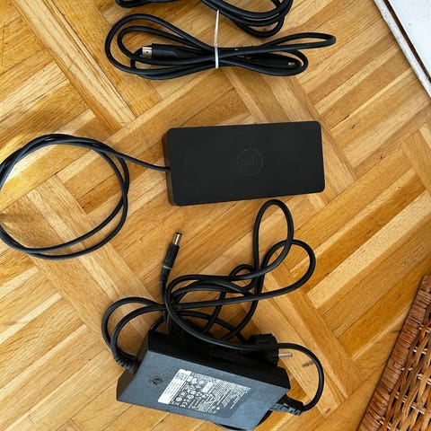 Dell dockningsstation i svart färg. Enheten har flera anslutningar, bland annat USB-portar, nätverksport (RJ45), VGA och ljuduttag. Dockningsstationen ansluts till datorn via kabel och kan användas för att koppla in externa skärmar, tangentbord, mus, nätverk och andra USB-tillbehör. Strömadapter medföljer enligt bild.