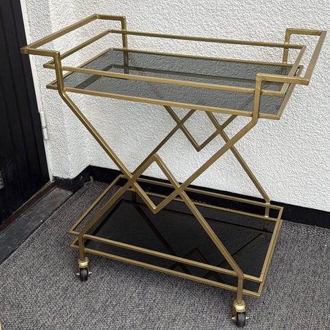 Serveringsvagn med två hyllplan i glas och stomme i mässingsfärgad metall. Vagnen har två större hjul och två mindre hjul för enkel förflyttning samt ett handtag på ena kortsidan. Övre hyllplanet är inramat med en dekorativ kantlist. Nedre hyllplanet har hållare för flaskor eller liknande. Passar som serveringsvagn eller barvagn i vardagsrum, matsal eller kök.