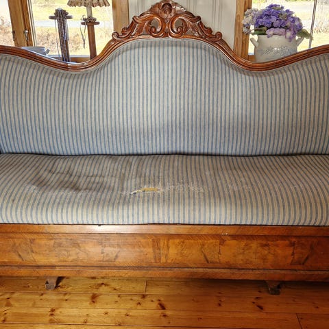 Soffa i trä med målad stomme och dekorativa utskärningar i rygg- och armstöd. Sits och rygg är klädda i randigt tyg i beige och gröna toner. Soffan har rak rygg och öppna gavlar med spjälor. Passar som sittmöbel till matbord.