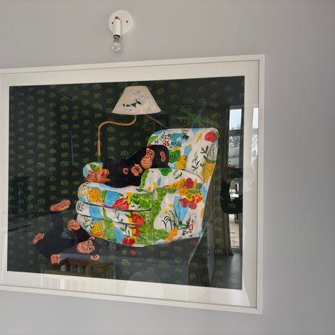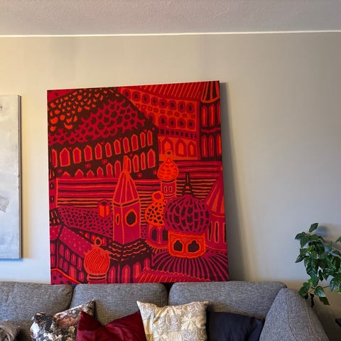 Abstrakt målning som väggtavla i flerfärgat motiv. Stor rektangulär duk med uttrycksfullt, färgstarkt mönster i blandade färger. Passar som dekorativ väggkonst i vardagsrum, sovrum eller andra inomhusmiljöer där man vill ha ett större konstverk som fokuspunkt.