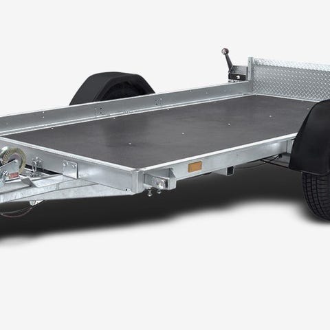 Tack vare fällbara fram- och baklämmar blir det enkelt att lasta längre gods, och tippfunktionen gör både lastning och lossning smidigare – perfekt för mindre maskiner som gräsklippare eller skotrar.