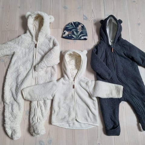Varma kläder till bebis i fint skick! Tre tröjor med dragkedja och en varm och mjuk overall. Storlek 68 men åt det mindre hållet.