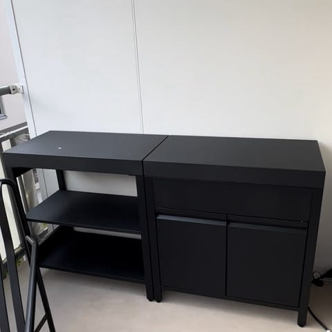 Balkongbord i svart metall, hängs på räcke. Inköpt på Åhléns för 3 år sedan, verkar inte finnas kvar i deras sortiment.