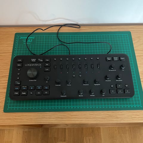 Loupedeck + fotoutrustning kontrollbord i svart färg. Enheten har flera knappar, rattar och reglage anpassade för bild- och videoredigering eller annan fotorelaterad användning. Ansluts med kabel. Lämplig som tillbehör i en fotostudio eller vid datorarbetsplats för mer detaljerad styrning av foto- och videoprogram.