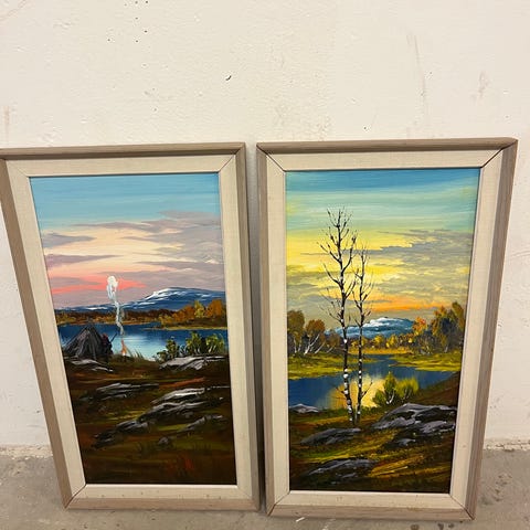 Set om två tavlor med guldfärgade träramar. Motiven är abstrakta målningar i varma färger. Den ena tavlan föreställer en stiliserad figur i abstrakt komposition, den andra visar en vas med blomma och två frukter mot en mjuk bakgrund. Fyrkantigt format på båda tavlorna. Passar som väggdekoration i exempelvis vardagsrum, hall eller sovrum. Måtten är höjd 85cm bredd 85cm.
