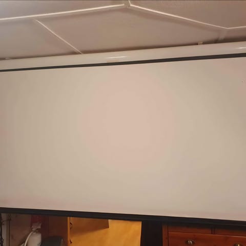 Vit projektorduk, bild bredd 240 cm. Kasettstorlek 270 cm. Lite kosmetisk bula på utsidan, påverkar inte funktion.