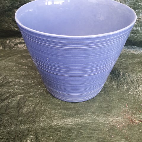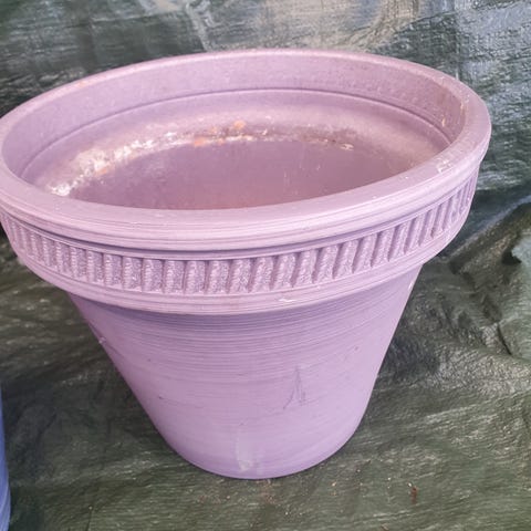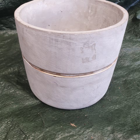 kruka med reliefmönster och blomdekor på framsidan. Krukan är i ljus, vit ton med strukturerad yta runtom. Öppen ovankant och rund form, lämplig för inomhusväxter eller som dekorationskruka. Materialet är keramik/stenliknande och insidan är slät för placering av innerkruka eller jord. Kan även användas utomhus