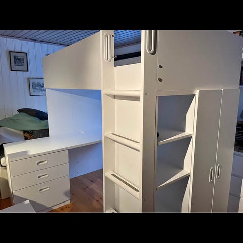 IKEA loftsäng ”VITVAL”med integrerat skrivbord. Sängen står på en vit stålram med stege på sidan och har grå sängpaneler runt liggytan. Under sängen finns ett fast skrivbord längs ena långsidan som ger arbets- eller lekyta. Passar i barn- eller ungdomsrum där man vill kombinera säng och arbetsplats på liten yta.