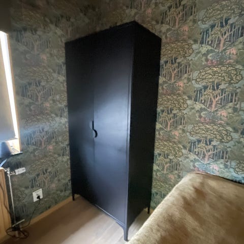 Denna garderob i beige stål har två dörrar som öppnar upp till fyra hyllplan och rymmer även plats för galgar.