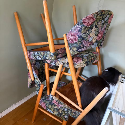 BENGT RUDA. KARMSTOL. Betsad bok, klädsel i textil , ryggstödet med "Pottery" av Stig Lindberg. "Triva", Nordiska Kompaniet, 1900-talets mitt. Plakettmärkt undertill.