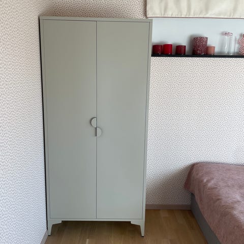 Den här höga garderoben i svart stål har två dörrar som öppnar upp till fyra hyllplan och rymmer även plats för hängare.