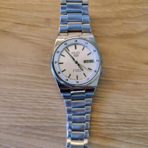 Seiko herrklocka armbandsur i stål med svart urtavla. Klassisk analog modell med arabiska siffror och datumvisning. Boett och länk är i rostfritt stål med viklås. Passar för vardagsbruk och som enkel dressklocka för män. 34mm.