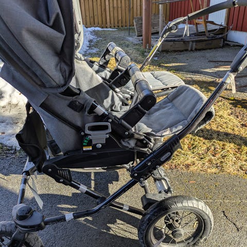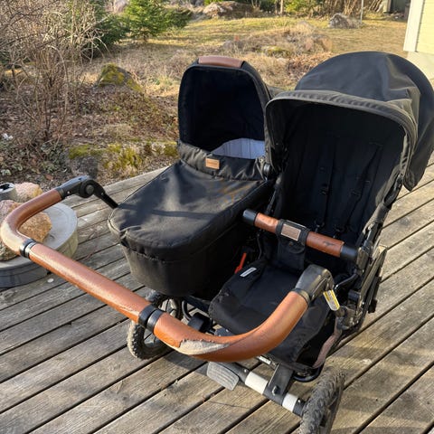 Stora lufthjul och stabilt chassi anpassat för två barn. Justerbart handtag och varukorg under vagnen. Sufflett över sitt- och liggdel ger skydd mot sol och väder. På en av sittdelarna har sömmen släppt lite, se bild. Enkelt att fixa om man vill.