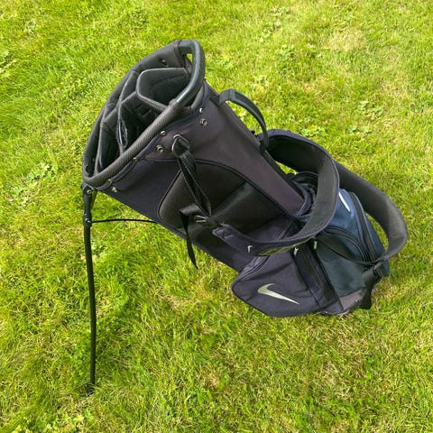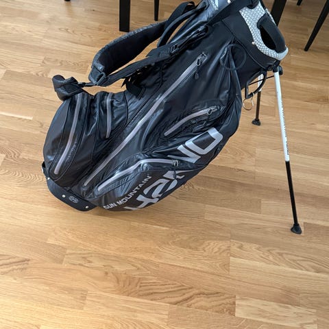 Callaway Hyper Dry C golfbag i svart färg. Golfbagen har bärremmar för att kunna bäras på ryggen och utfällbara ben för att stå stabilt på marken. Topp med flera fack för separering av klubbor. Flera ytterfack för förvaring av tillbehör, kläder och värdesaker. Medföljande regn- eller skyddshuva i svart tyg ingår.
