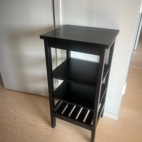 Vilto badrumshylla i svart trä. Fint skick. Hämtas i Sumpan/Mariehäll