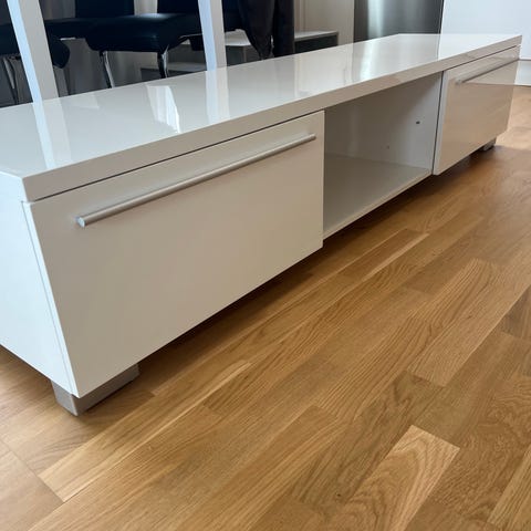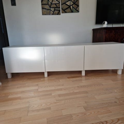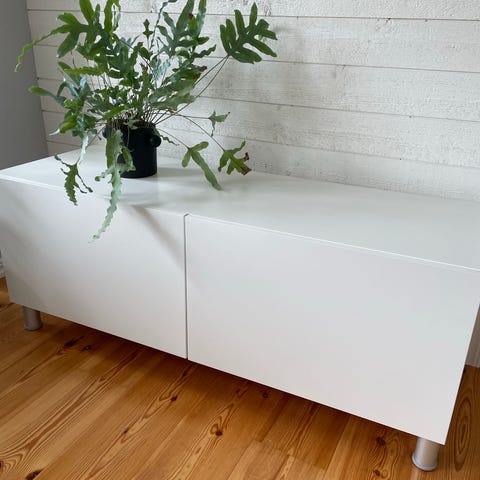 IKEA förvaringsbänk i vit färg. Bänken har två dörrar på framsidan och invändigt finns flera hyllplan som ger god översikt och organiserad förvaring. Möbeln står på runda ben som ger stabilitet och gör det lättare att städa under. Passar exempelvis som tv-bänk, sideboard eller förvaringsmöbel i vardagsrum, hall eller sovrum.