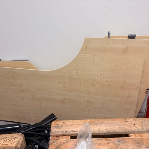 Snygg disk i eklaminat. Mått H 110 cm/75 cm, L 3210 cm, D 86 cm radie 200 cm. Bänkskiva mot " "kund" 25 cm. Disken finns i Borås.
