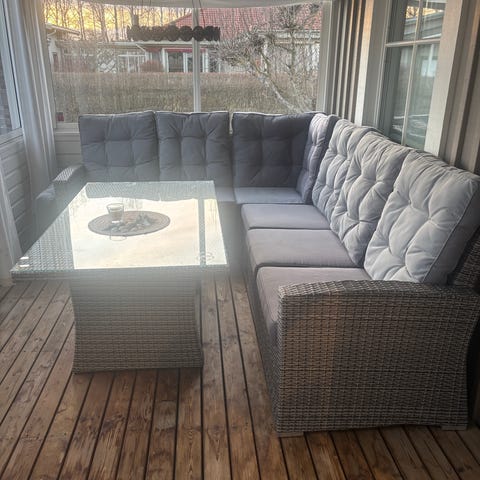 Utemöbelset i konstrotting, soffa med grå sitt- och ryggdynor samt ett rektangulärt bord med glasskiva. Glasskiva har en del fläckar.