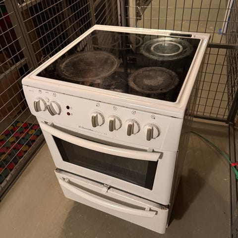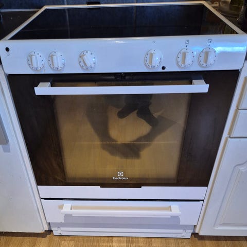 Spisen har glaskeramikhäll med fyra kokzoner och inbyggd ugn med glaslucka. Reglage sitter framtill med vred för ugn och plattor.