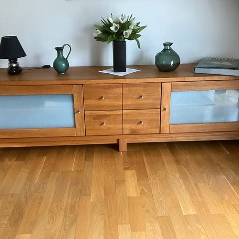 DUX Bruno Mathsson förvaringsmoduler sideboard i trä. Består av flera moduler med skåp, lådor och öppna fack för förvaring och exponering. Träkonstruktion med frontluckor och lådor, samt öppna hyllfack som kan användas för böcker, dekoration eller mediautrustning. Passar som sideboard, mediabänk eller förvaringsmöbel i vardagsrum, hall eller arbetsrum.