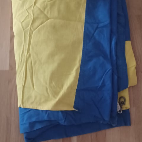 Svenska flagga från svenska flaggfabriken i gbg. Den är 420×260 den har fläckar men går säkert att ta bort. Skulle säga att det är inget man ser när den är öppe. Den är i bomull. Och flaggan rätt gammal. Men väldig fin. Se bilderna.