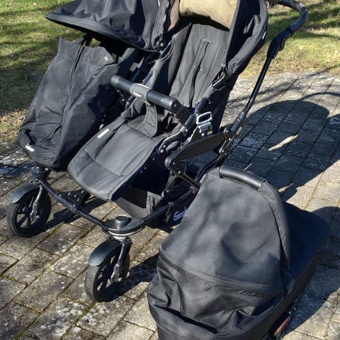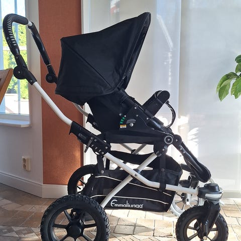 Emmaljunga Superviking från 2019 med liggdel och sittdel. Använd till två barn. Vagnen har stora lufthjul med grovt mönster och svängbara framhjul. Den är stabil och stadig och varukorgen tar mycket last.