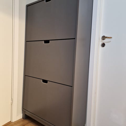Vit skohylla i stilren design med plats för 12 par skor (4 par per fack). Rymligt och praktiskt.