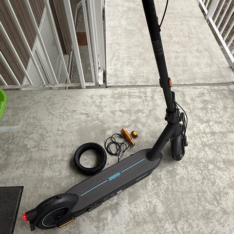 uppgraderingar: extrabatteri samt sharkset framdämpare, det sägs att elscooterna ska ha 95km räckvidd med det extrabatteri i rätt förhållanden.