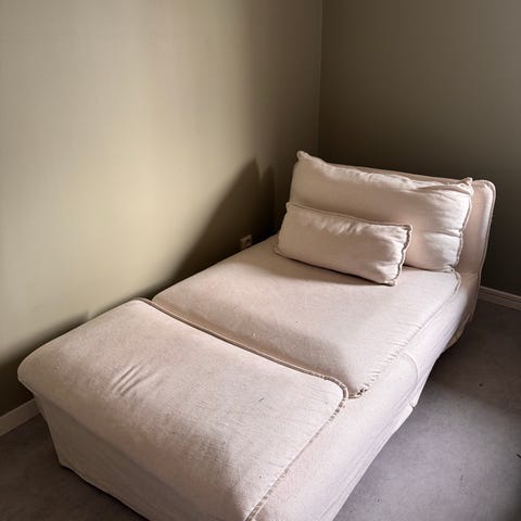 Soffan är 170 cm lång och huvudstödet är i vitt tvättbart överdrag, 20 cm djup.