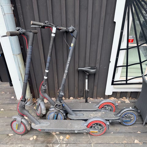 Parti med flera elsparkcyklar i svart och grå färg. Modellerna varierar något i utförande, vissa med större däck och skivbroms fram. Passar som reservdelsbas eller för den som vill reparera och använda elsparkcyklarna vidare. Säljs tillsammans som ett parti enligt bilderna. Säljes som reservdelar nån funkar säkert