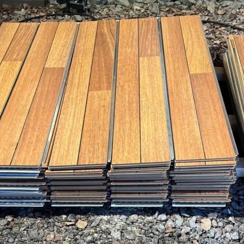 Trallplattor i trä för uteplats eller balkong. Plattorna består av trälameller monterade på plastunderlag som klickas ihop. Passar för att lägga ett trägolv på exempelvis balkong, altan eller annan hård yta utomhus. Flera plattor finns staplade på bilden, vilket möjliggör täckning av en större yta beroende på antal plattor som används.