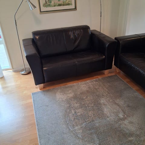 Fin grå hörnsoffa I äkta skinn. Gott skick - en dyna är lite sliten. Soffan håller sig "snygg" och är bekväm att sitta i. Soffan är ca 275 cm på längden och går ut ca 215 cm.