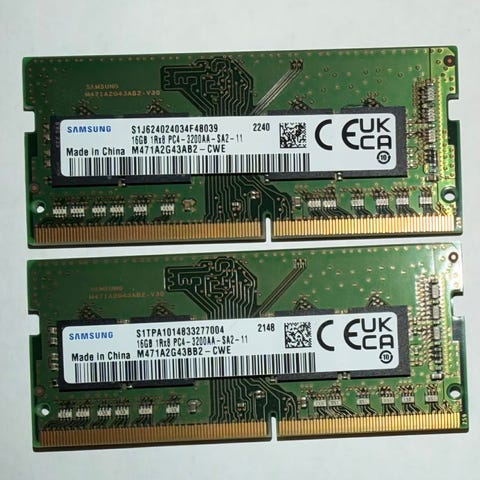 Två stycken DDR4 SO-DIMM RAM-moduler från Samsung, vardera på 16 GB kapacitet. Avsedda för bärbara datorer eller andra enheter som använder SO-DIMM DDR4-minne. Passar som uppgradering eller ersättning av befintligt minne, förutsatt att systemet stödjer DDR4 SO-DIMM-moduler med denna kapacitet.