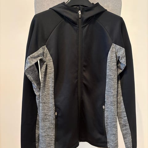 SOC löparjacka för barn i storlek 152. Jackan är grå med avtagbar huva, en ficka och dragkedja framtill. Reflekterande detalj finns på ryggen för ökad synlighet vid löpning. Tunn och lätt modell som passar för löpning och annan träning.