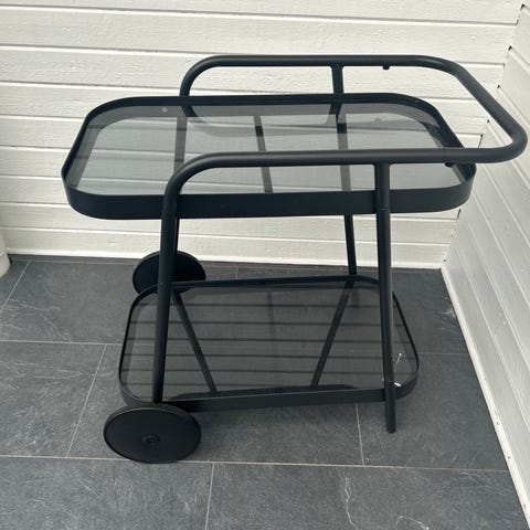 Serveringsvagn i svart metall med två hyllplan. Övre och nedre hyllplanet består av ribbade skivor i metall. Vagnen har två ben med fasta fötter och två ben med hjul för enkel förflyttning. Passar för användning inomhus eller utomhus, exempelvis som avlastningsbord, serveringsvagn eller sidobord på altan eller balkong.från Åhléns.