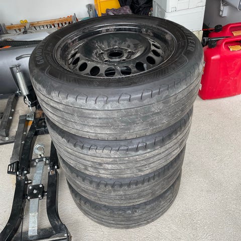 Väldigt fina däck på alufälgar. Har varit på en Toyota Avensis 03 men ska även passa Skoda Oktavia tror jag.. Fälgarna har en del färgsläpp o saknar centrumkåpa men är helt ok.