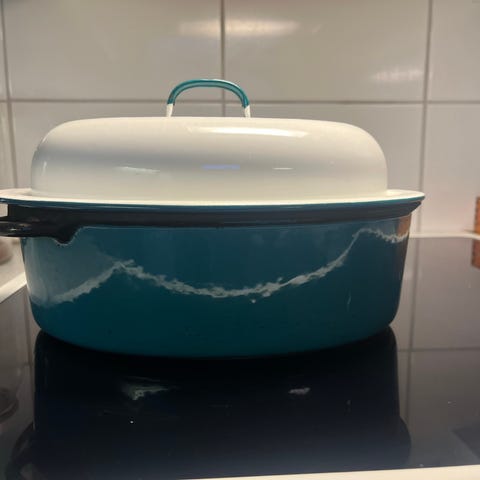 Gryta med lock, emalj och gjutjärn, rymmer 5 liter.