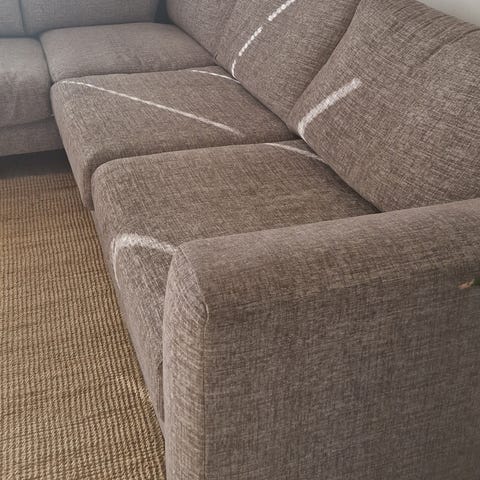 Avtagbar klädsel, delvis fläckig som går bort i tvätt. Ej nedsutten, så i gott skick.