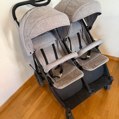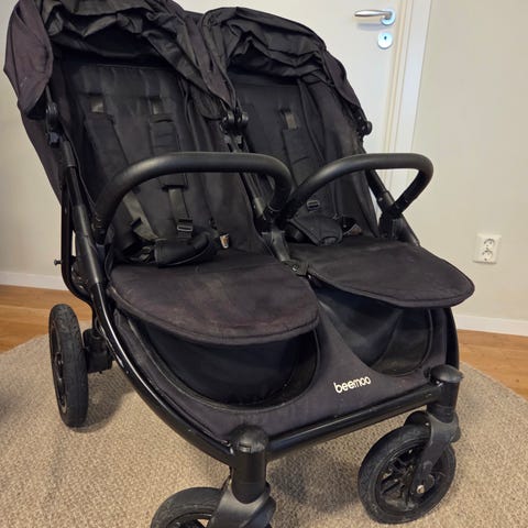 Beemoo BFF60 syskonvagn/dubbelvagn med två sittdelar. Liggdel i fint skick för nyfödd som sätts fast enkelt med adaptrar.