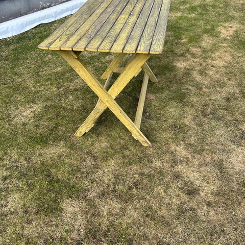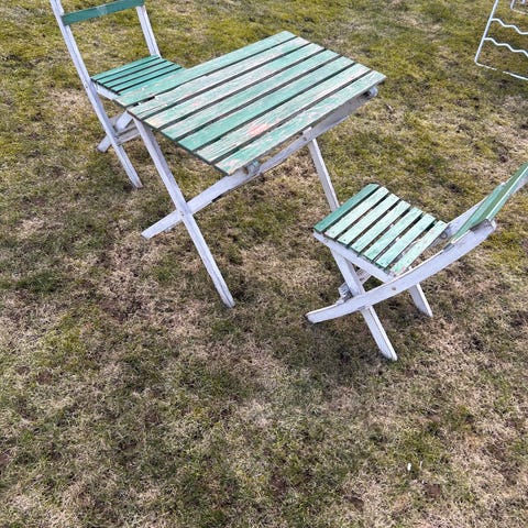 Trädgårdsgrupp med bord, soffa och stolar i vitmålat trä. Gruppen består av ett rektangulärt bord med ribbad bordsskiva, en ribbad soffa samt två ribbade stolar. Möbelgruppen är avsedd för utomhusbruk i trädgård, på altan eller uteplats. Designen är klassisk med raka linjer och ribbor i sitsar och bordsskiva. Bord, soffa och stolar är fristående och kan placeras efter behov. Obs inget nytillverkad utan gamla möbler i bra skick