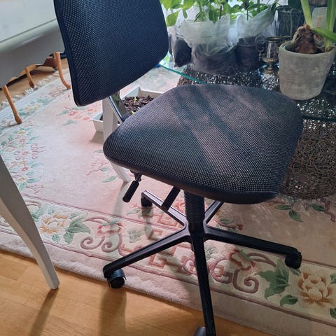 Mycket sliten sits men fungerar tekniskt och sitthöjden kan varieras mellan 52 och 80 cm. Sitsen är 44x42 cm. I högsta läge är ryggstödet ca 120 cm från golvet