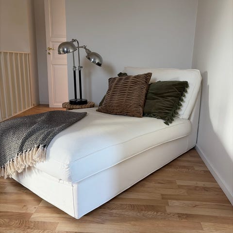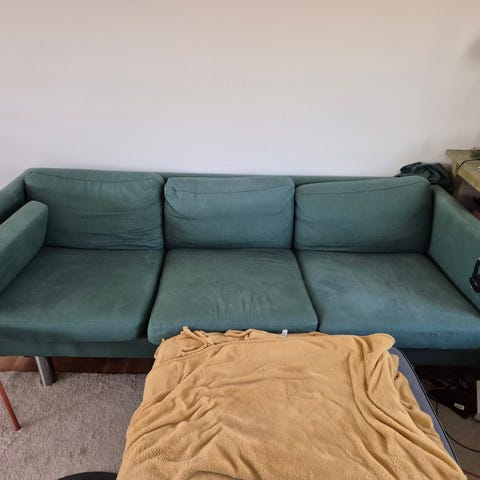 Soffan har bara stått i utrymme. Klädseln är i fint skick men behöver tvättas. Kuddar och pläd ingår ej.